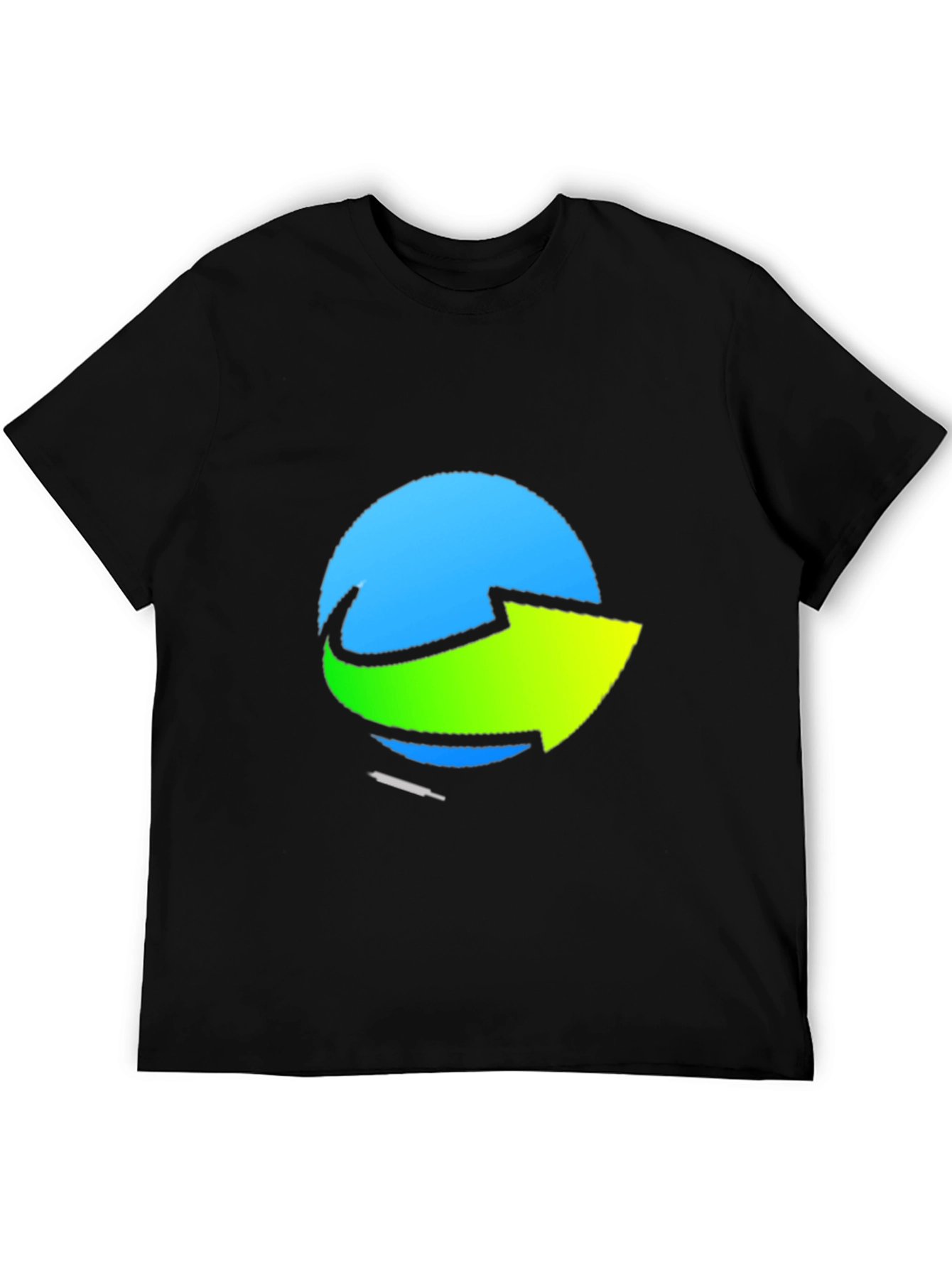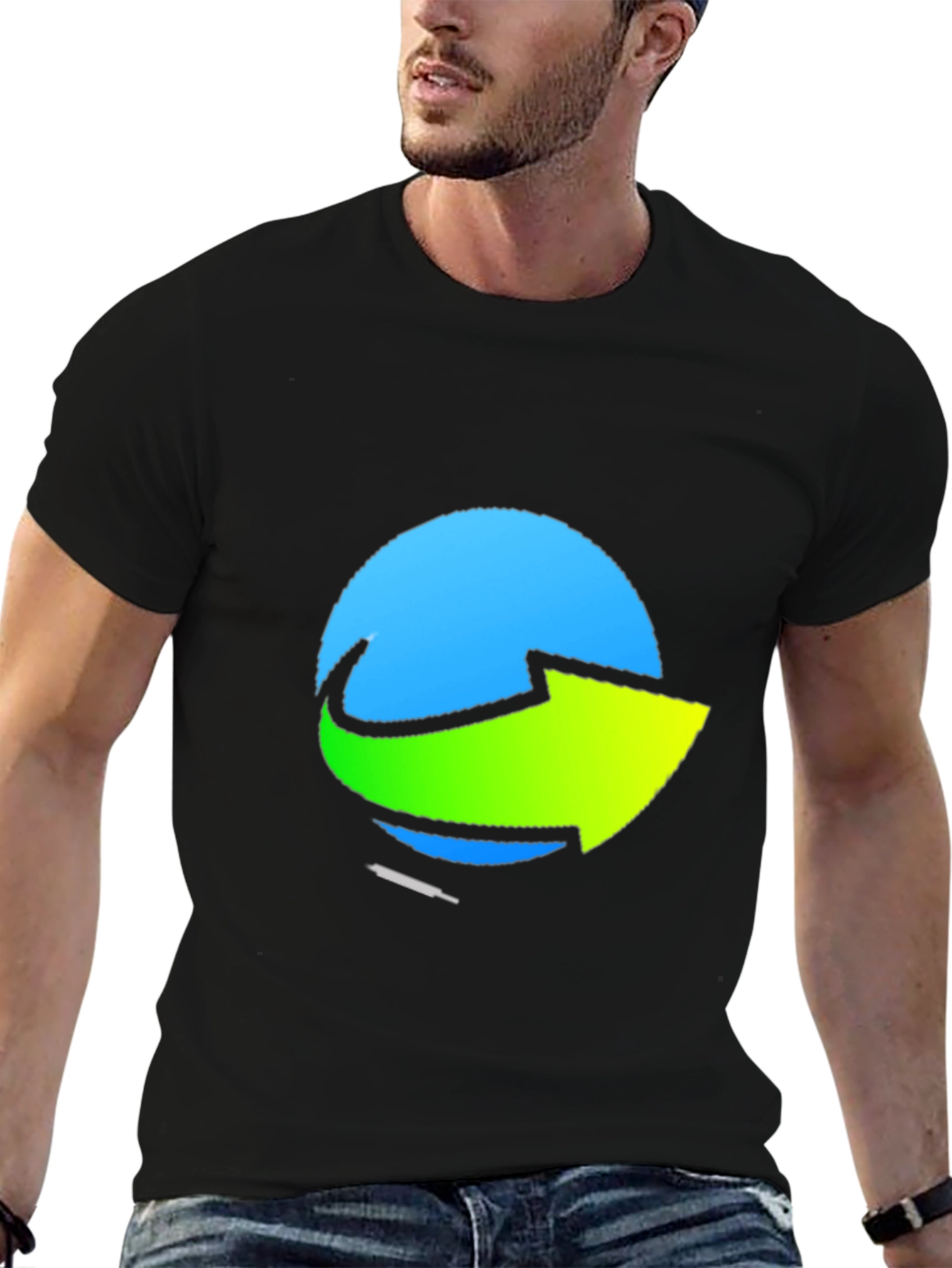Elevate your casual wardrobe with this eye-catching black t-shirt. The shirt features a unique graphic design with a blue circular backdrop and a vibrant green arrow across the front. Made from a soft, breathable fabric, this tee offers both style and comfort. The print is bold and stands out, ensuring you'll make a statement wherever you go. Perfect for everyday wear, casual outings, or as a gift for someone who appreciates modern designs. Pair it with jeans, shorts, or joggers for a cool and relaxed look. A must-have for any fashion-forward individual!