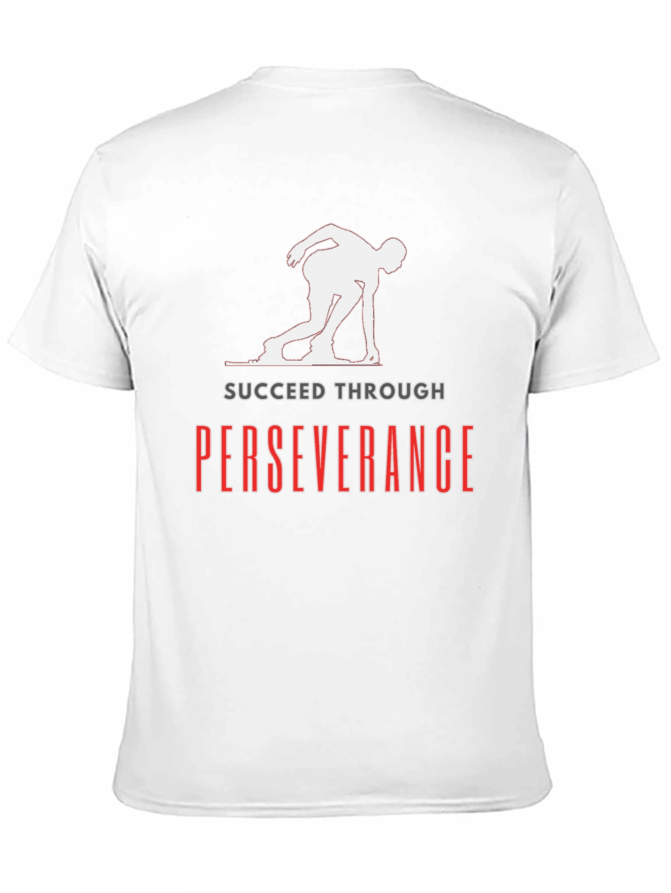 This black t-shirt features a powerful message of perseverance, designed for those who strive for success. The shirt showcases a silhouette of a runner in a starting position, symbolizing determination and focus. Above the runner, the phrase "SUCCEED THROUGH" is printed in gray, with "PERSEVERANCE" boldly displayed below in red. Made from comfortable, breathable fabric, this t-shirt is ideal for workouts, casual wear, or as a motivational reminder to stay committed to your goals. Its classic fit and durable print ensure lasting style and inspiration. Wear your ambition, embody resilience!