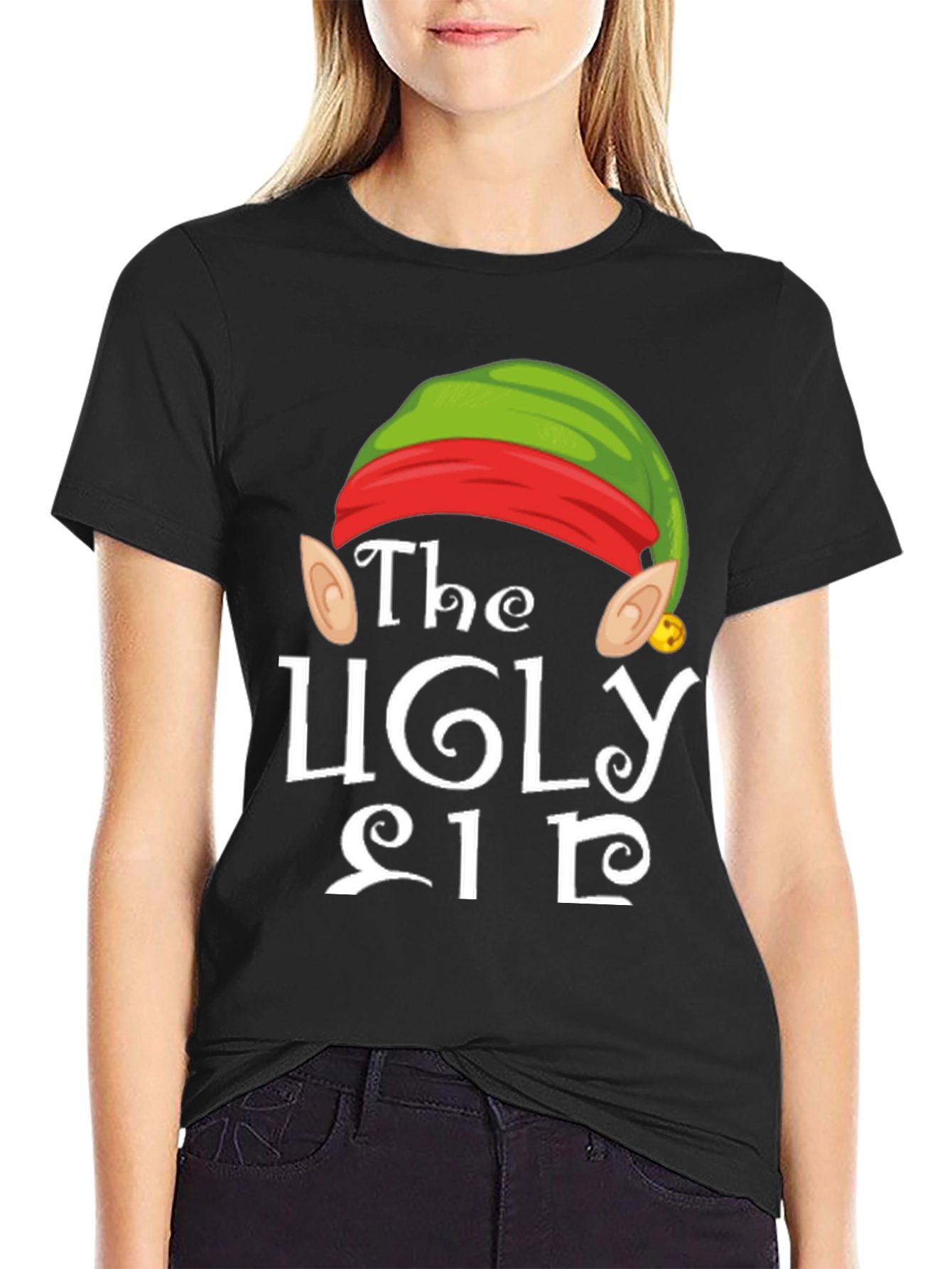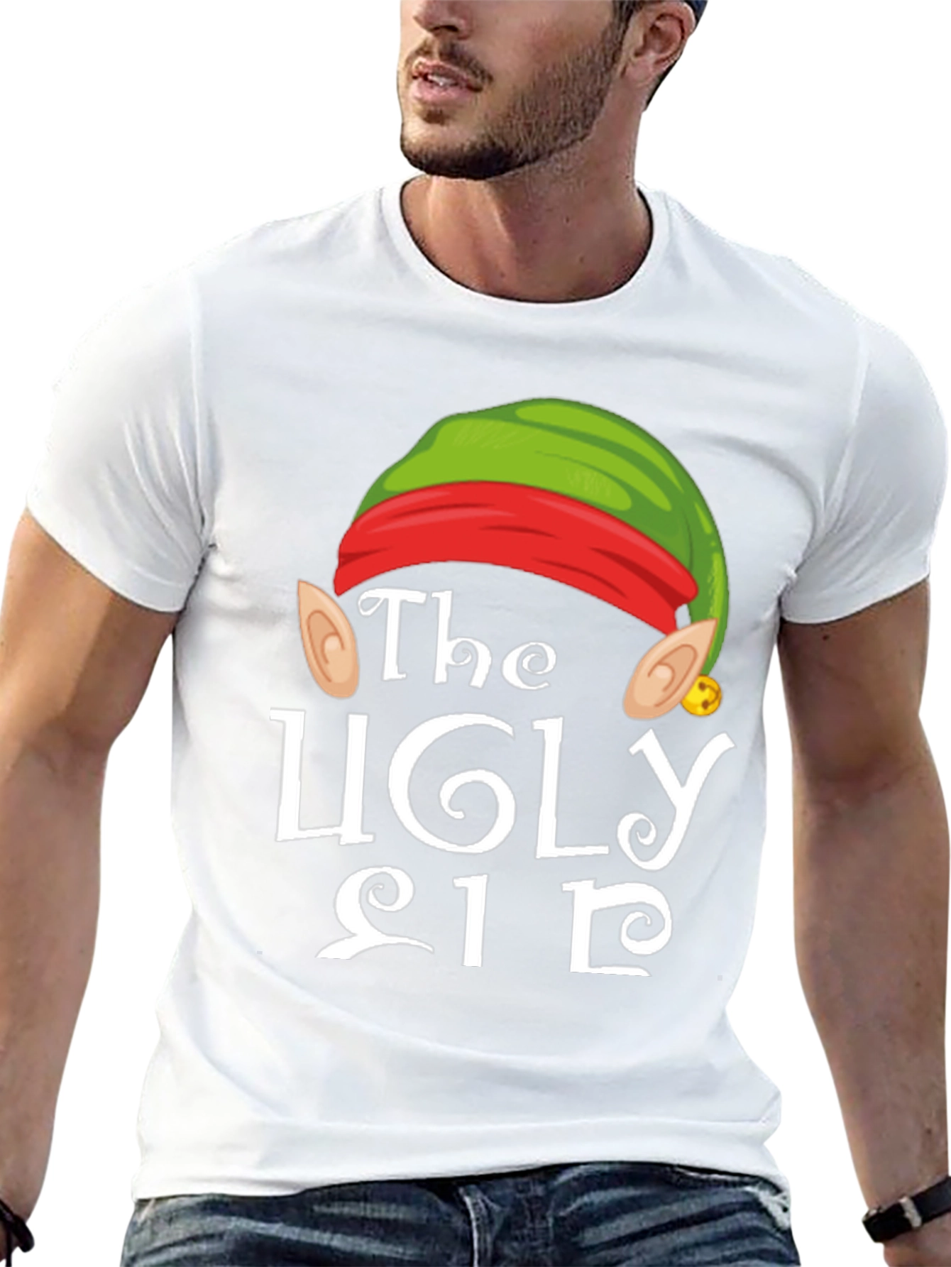Embrace the holiday spirit with this fun and festive "The Ugly Elf" T-shirt! Featuring a playful elf hat design complete with ears and a tiny bell, this shirt is sure to bring a smile to everyone's face. The crisp white lettering pops against the black background, making the design stand out. Perfect for Christmas parties, family gatherings, or simply spreading holiday cheer, this comfortable tee is a must-have for the season. Get ready to be the life of the party in this eye-catching and unique holiday shirt!
