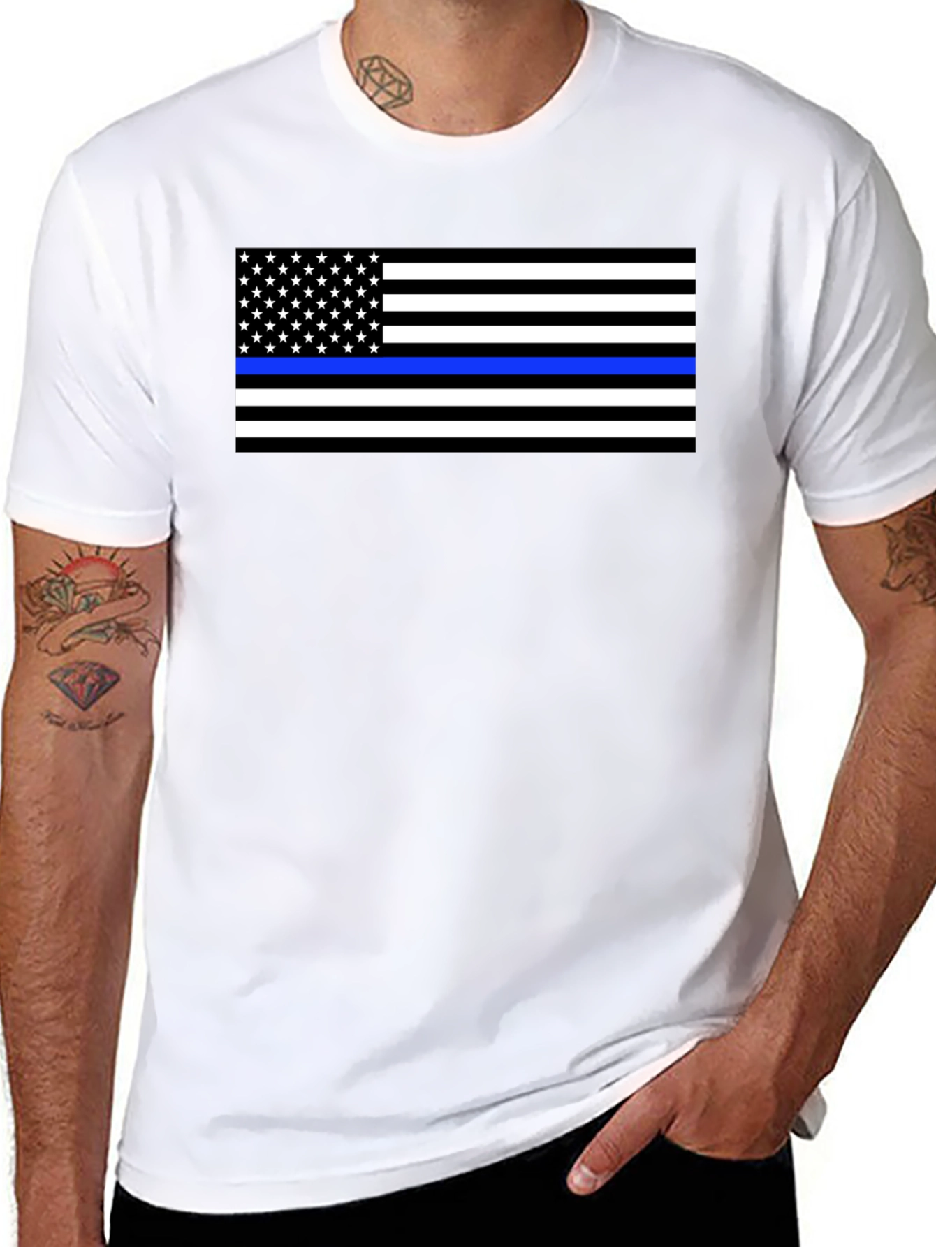 Show your support with this striking black t-shirt featuring a 'Thin Blue Line' American flag design. The flag is prominently displayed on the chest, with crisp white stripes and stars contrasted by a bold blue line symbolizing law enforcement. Made from what appears to be a soft and comfortable cotton blend, this tee offers both style and comfort for everyday wear. The classic crew neck and short sleeves ensure a relaxed fit, making it perfect for casual occasions or showing solidarity at events. This shirt is a powerful statement and a comfortable addition to any wardrobe.