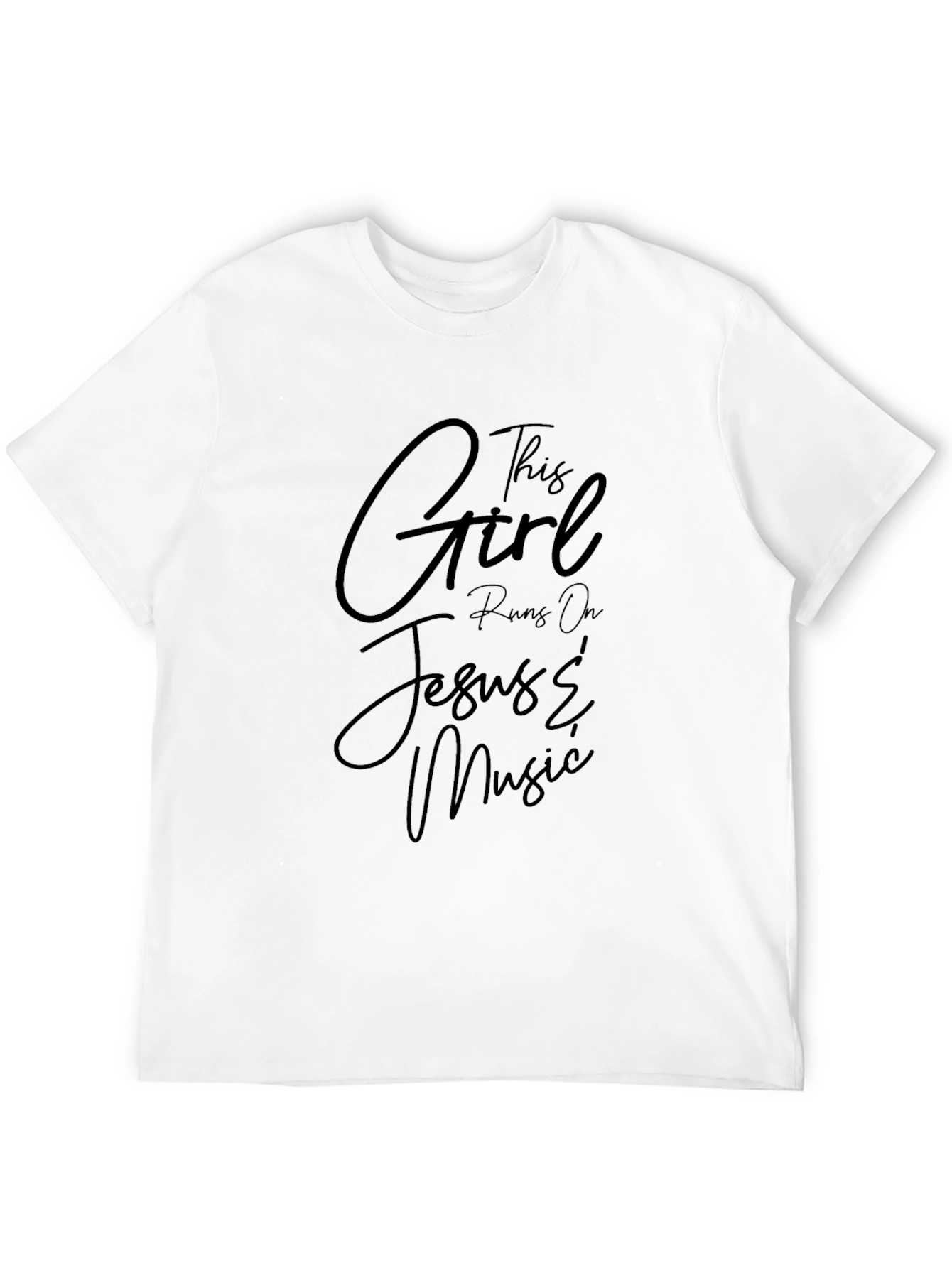 Express your faith and love for music with this stylish black t-shirt. The shirt features a trendy design with the phrase "This Girl Runs On Jesus & Music" in a elegant script font. Made from soft and comfortable fabric, this tee is perfect for everyday wear or for expressing your beliefs and interests at church, concerts, or casual outings. Pair it with jeans, shorts, or a skirt for a versatile look that showcases your unique personality. Makes a great gift for music lovers with a strong faith.